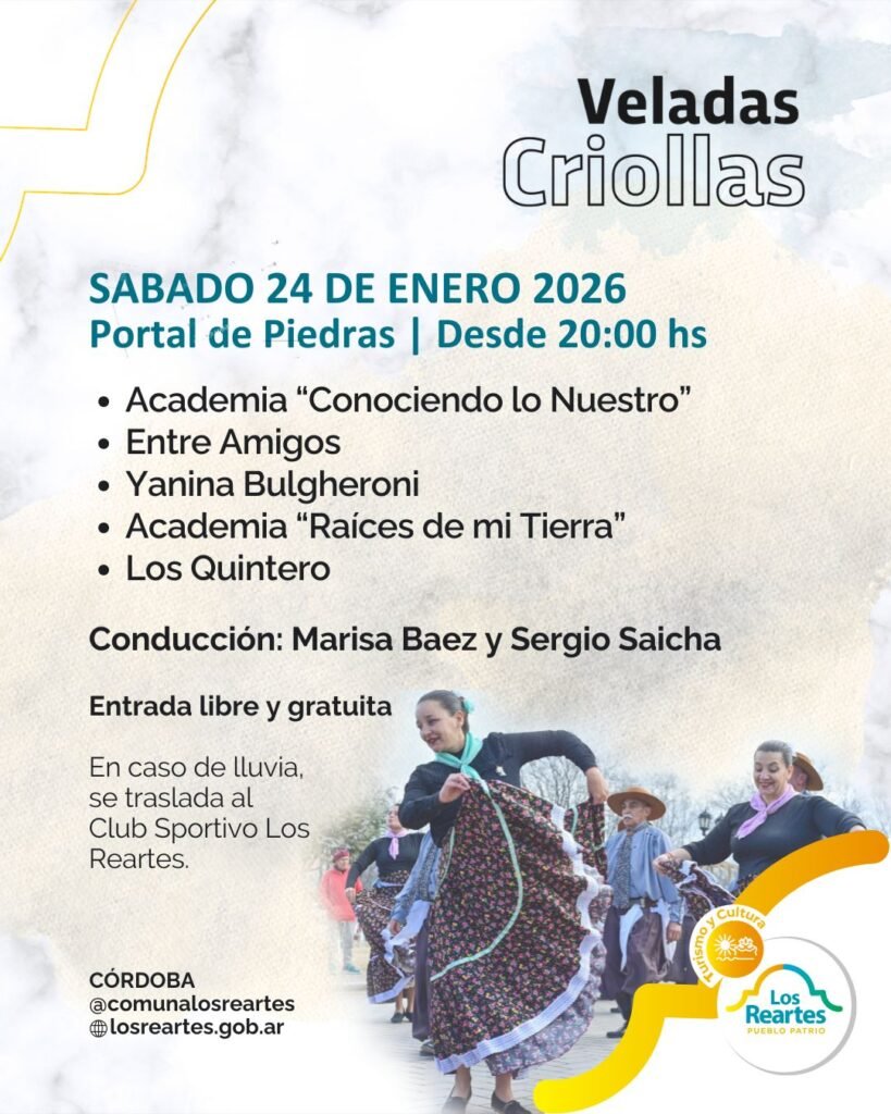 El próximo sábado 24 de Enero, nos encontramos en Los Reartes para disfrutar de una noche bien nuestra, al ritmo de la música y las danzas tradicionales con una nueva edición del tradicional evento de verano: Veladas Criollas.